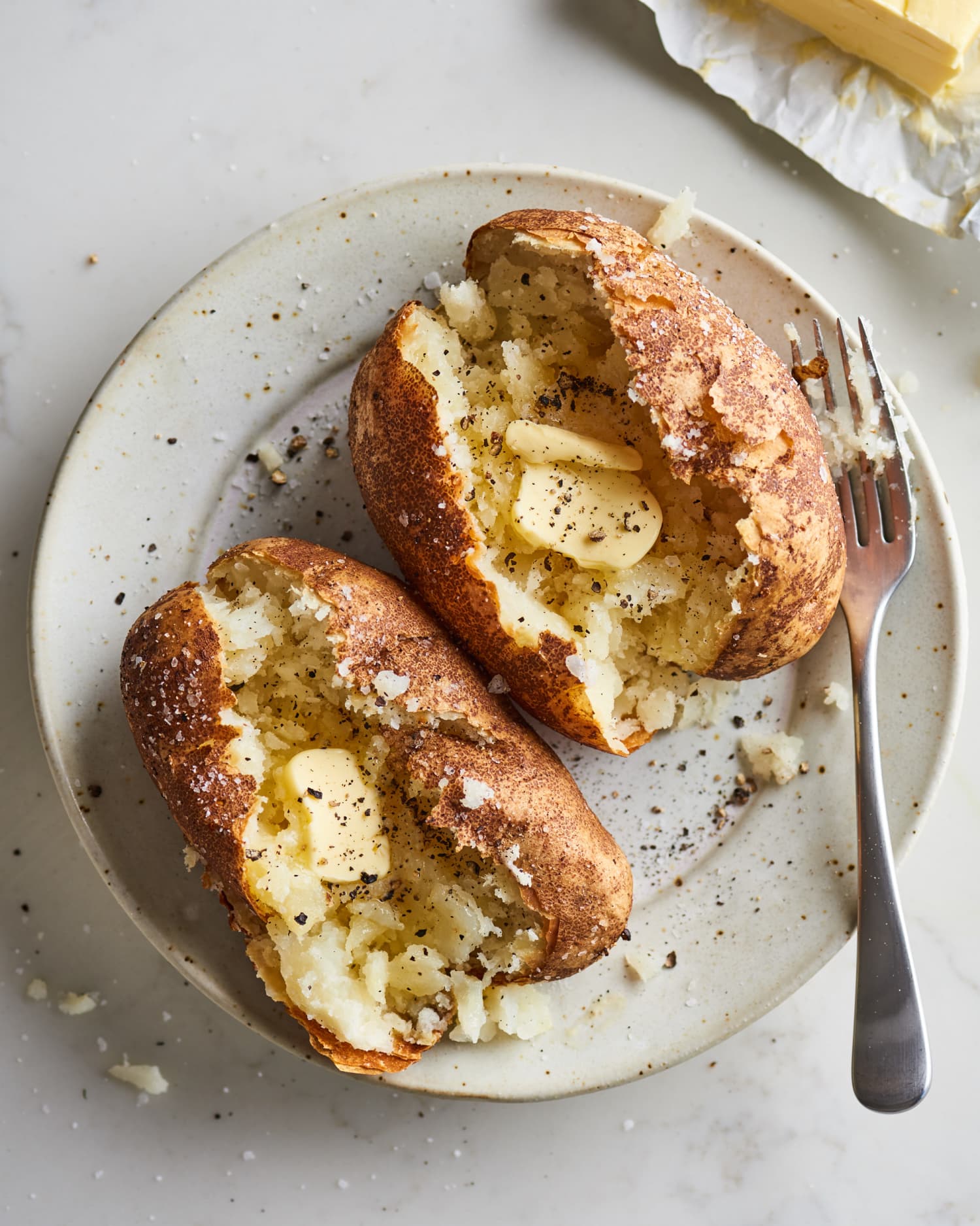 Baked potatoes taste best straight from the oven.